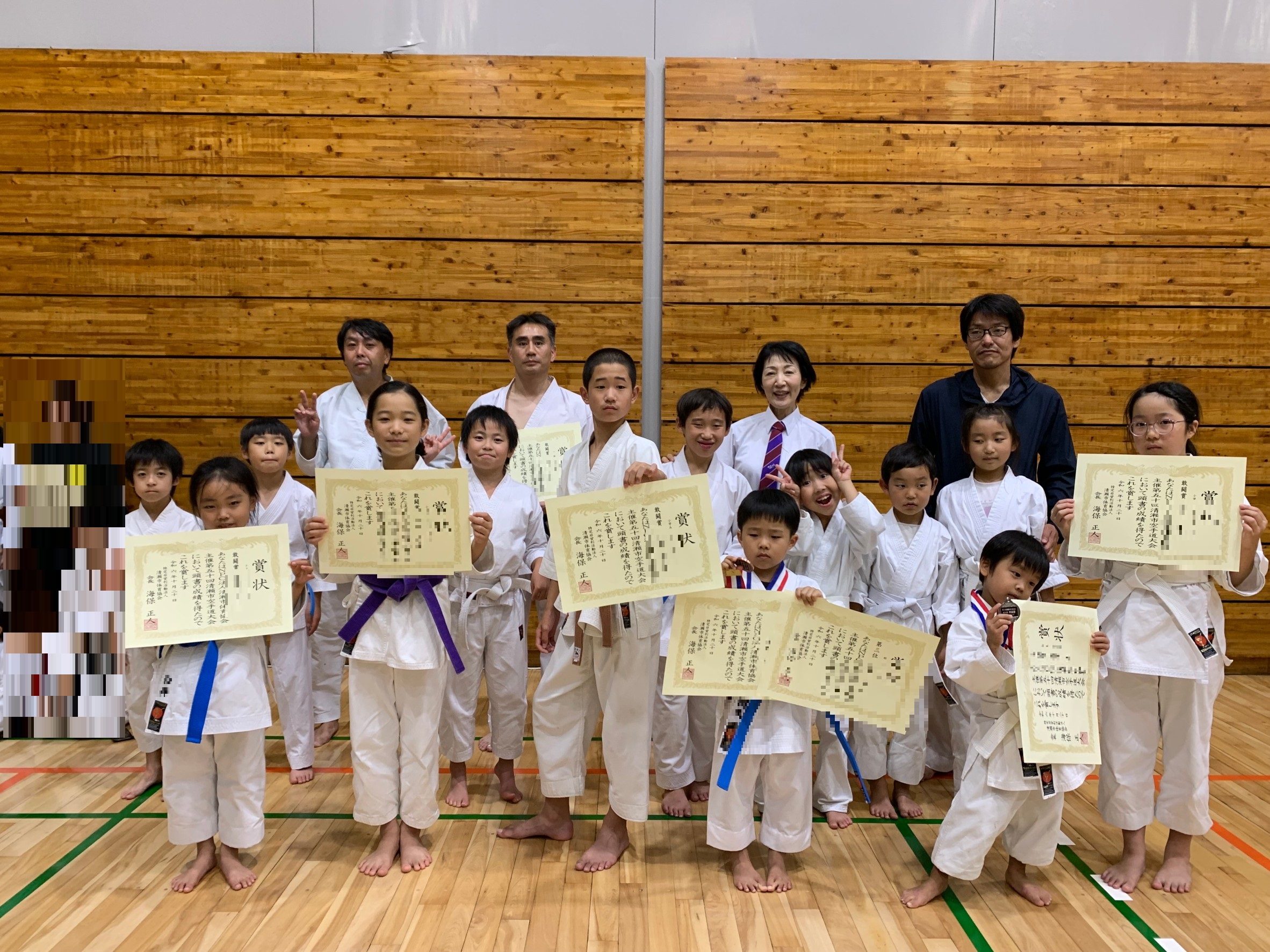 戦績です。形は5年生女子が惜しくも三回戦敗退の敢闘賞、幼年の部の二人も敢闘賞、ファミリー団体の部は1組が決勝戦に残る善戦をして敢闘賞を頂きました。