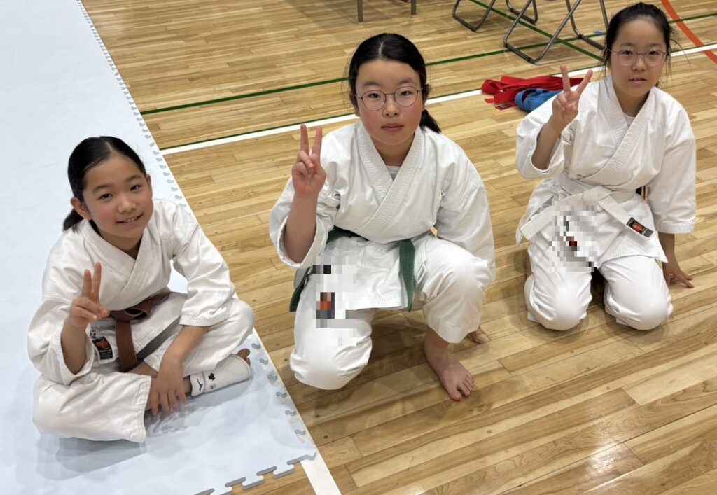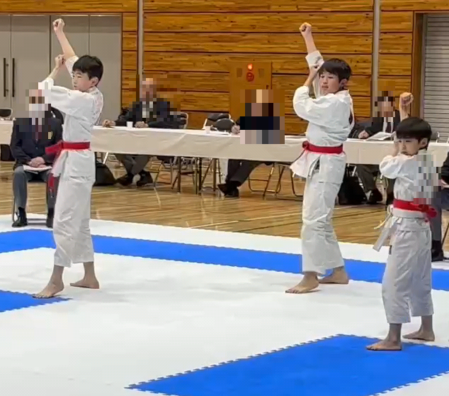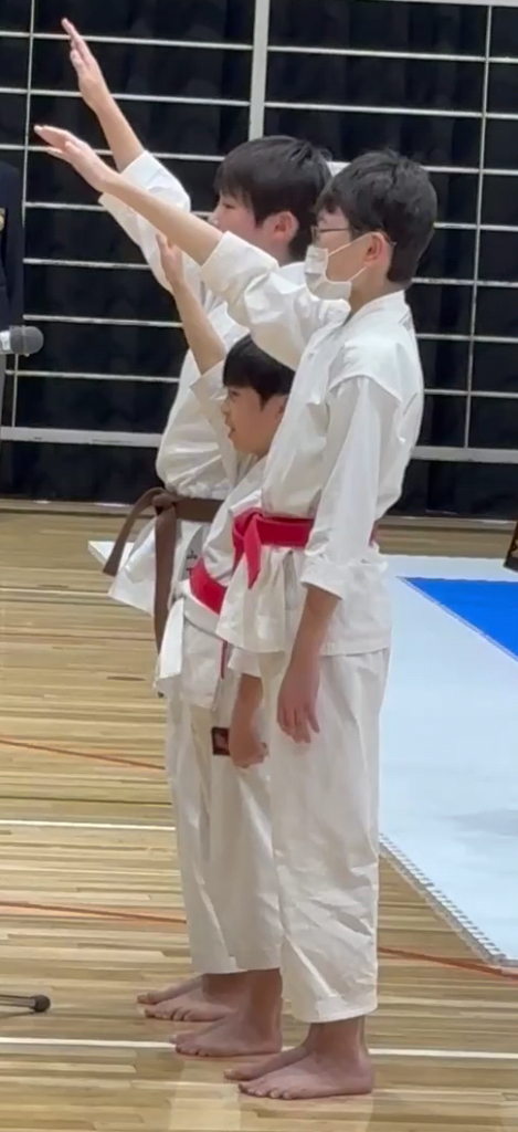 昨年は5、6年チームの1組が形、組手とも優勝したので、今年は選手宣誓の大役を任せられました。6年生3人、小学生最後の大会で、思い出に残る選手宣誓でした。”我々選手一同は、日々友と切磋琢磨し、積み重ねてきた練習の成果を発揮し・・”
